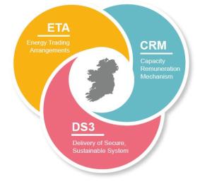 The SEM comprises three distinct areas that provide revenue streams relating to the services provided by market participants. The Energy Trading Arrangements (ETA), Capacity Remuneration Mechanism (CRM) and Delivering a Secure Sustainable Electricity System (DS3) make up the three main pillars of the market.